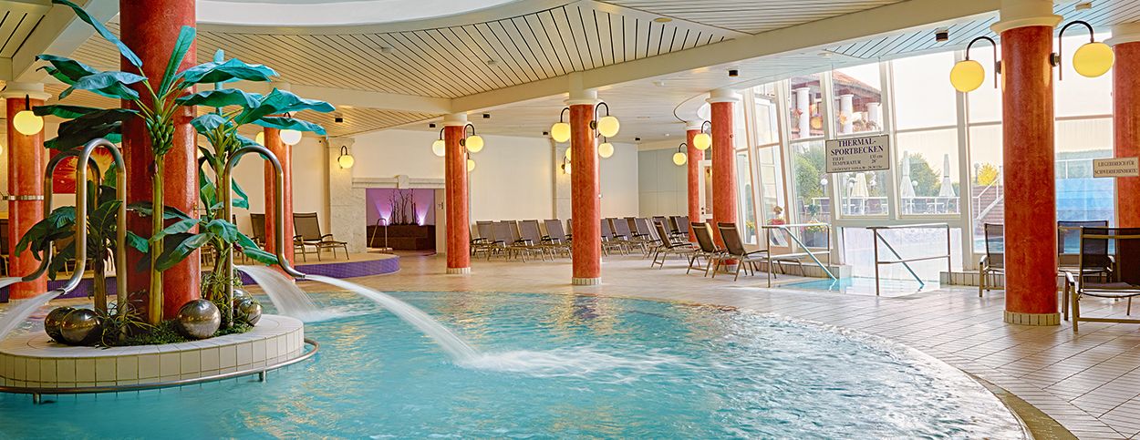 Erholen Sie sich im 3.300 m² großen Badebereich der Fürstentherme mit Thermalinnen- und Thermalaußenbecken, Whirlpool, Sauna, Dampfgrotte, Kneippbecken, Erlebnisdusche, Ruhebereiche mit Liegen, im Sommer mit Außenliegen und Trinkbrunnen.
